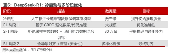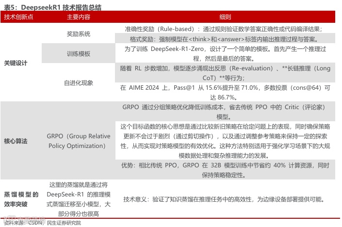 Deepseek开源模型,推动“算法-芯片协同进化”。Deepseek开源推理模型R1引起产业变革,低成本高效能的模型开源,推动了行业的整体发展。由于硬件GPU使用受限,Deepseek采用软件端技术创新提升训练效率,整体训练成本约为550万美元,仅为OpenAI o1开发费用的3%。Deepseek R1通过关键设计的奖励系统、训练模板、自进化现象,以及用于强化学习的核心算法GRPO,用低算力的GPU训练出了媲美OpenAI o1的模型,证实了在AI行业中,软件端算法的创新可弥补硬件端差异,也可推动行业整体发展并产生经济效应。云天励飞持续强调的算法芯片化,通过自定义指令集、处理器架构及工具链的协同设计,通过软件端的改良提升芯片能力,从而拓展推理应用市场。