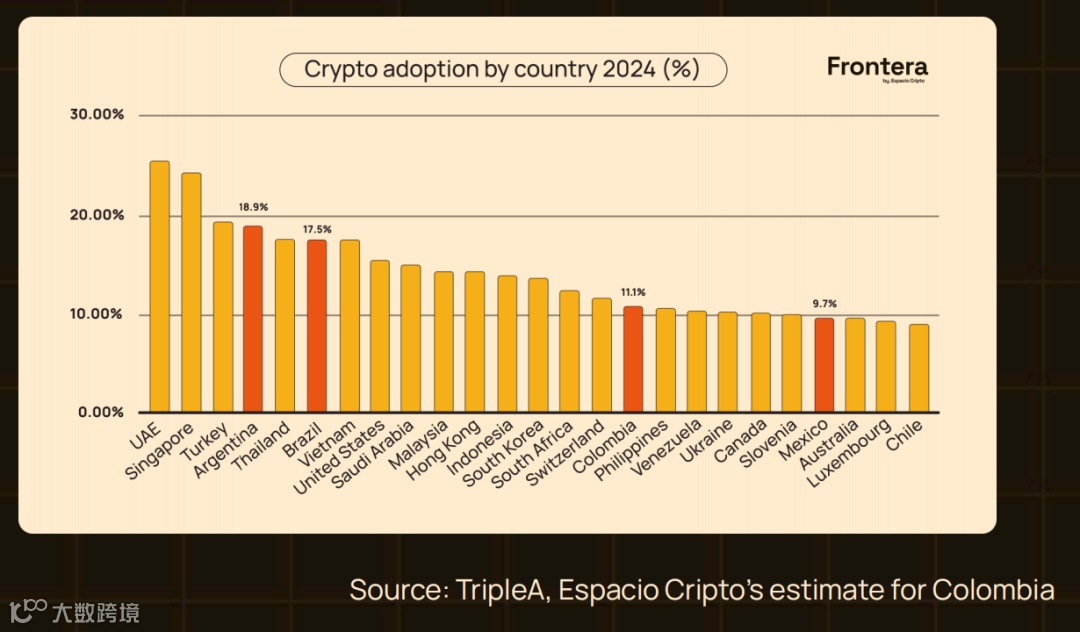 但机会同样巨大。数字经济蓬勃发展、年轻人口结构优越、金融科技生态火热,为加密普及奠定肥沃土壤。传统支付与汇兑体系难以覆盖全部人群,催生对替代方案的巨大需求——其中侨汇更是头号场景。当前墨西哥加密渗透率仍落后于阿根廷、巴西,而经济总量却居区域第二,这意味着只要政策明朗,增长空间将呈倍数级释放。