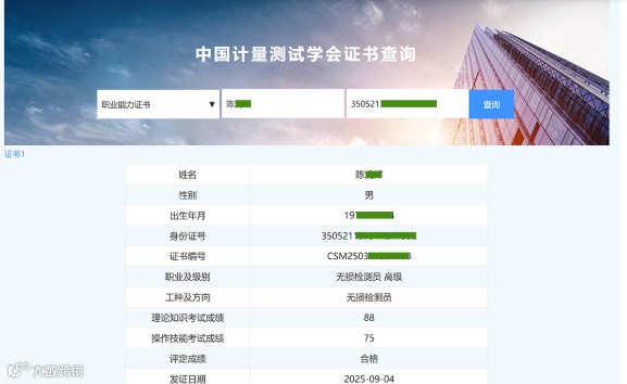 第三步:在“中国计量测试学会”查询界面,类别选择“职业能力证书”,输入手机号和身份证号即可查询证书详情,查询结果显示如下: