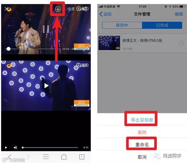 安卓端使用方法和IOS基本一样:播放视频后右上方会弹出「下载」按钮,下载完视频后在浏览器的「文件管理」中可以重命名并导出至相册