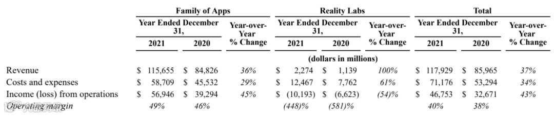 Meta业务结构主要可以分为应用业务(包括Facebook、Instagram、Messenger、WhatsApp等)和Reality 实验室(Reality Labs)(包括AR/VR硬件、软件和内容)业务。