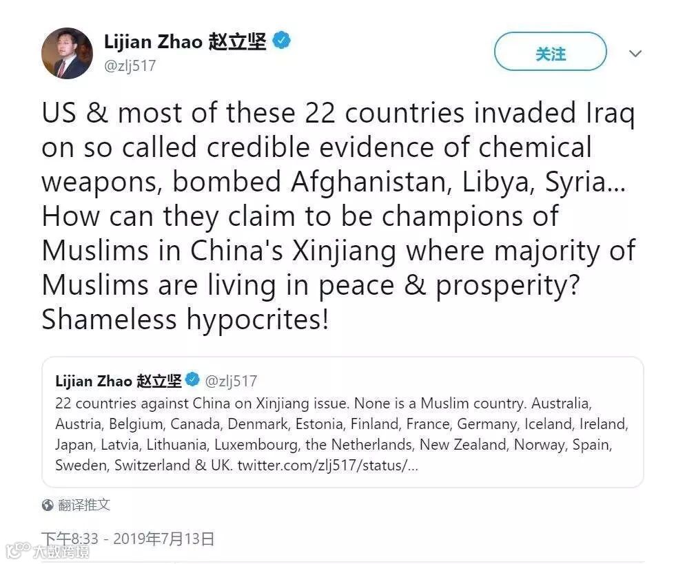 事情原委是这样的——7月13日,赵立坚通过推特呼应37国对中国新疆治理的支持,批评西方22国对中国新疆政策的抹黑。