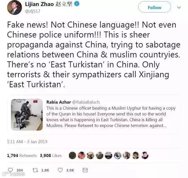 对此,赵立坚2019年1月3日两次发帖进行澄清。他首先表示,视频中的人说的根本不是中文,穿的也根本不是中国执法人员的服装,中国根本没有“东突厥斯坦”这个地方,只有恐怖分子和他们的同情者才会把新疆说成是所谓的“东突”。