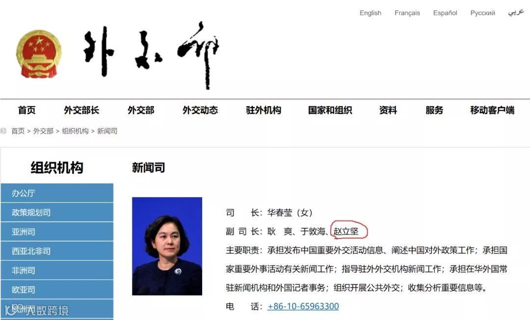 近日,有细心的网友发现,外交部官网“组织机构”一栏更新显示,外交部新闻司多了一位副司长——赵立坚。