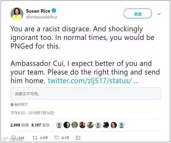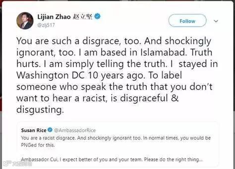 此文引起美前驻联合国大使苏珊·赖斯(不是美国前国务卿康多莉扎·赖斯)的激烈回应,她透过推特直呼赵立坚“你是个可耻的种族主义者,而且惊人的无知”。