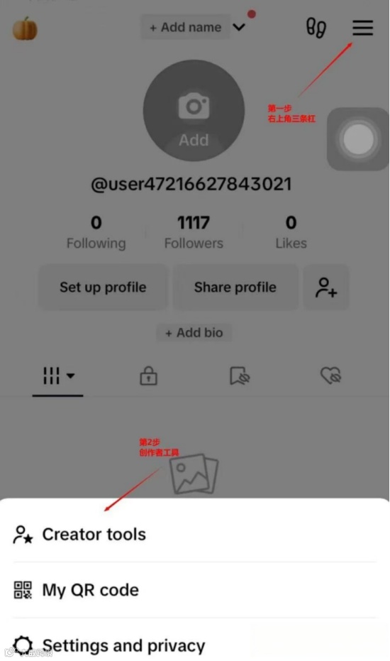 进入 TikTok 个人页面,点击右上角的三条杠(菜单按钮)。在弹出的菜单中,选择Creator Tools(创作者工具)。