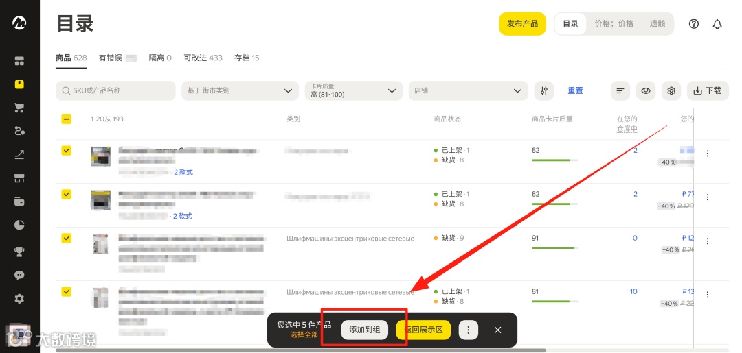 需批量合并变体时,可依次选中目录中的商品后点击 “添加至组”