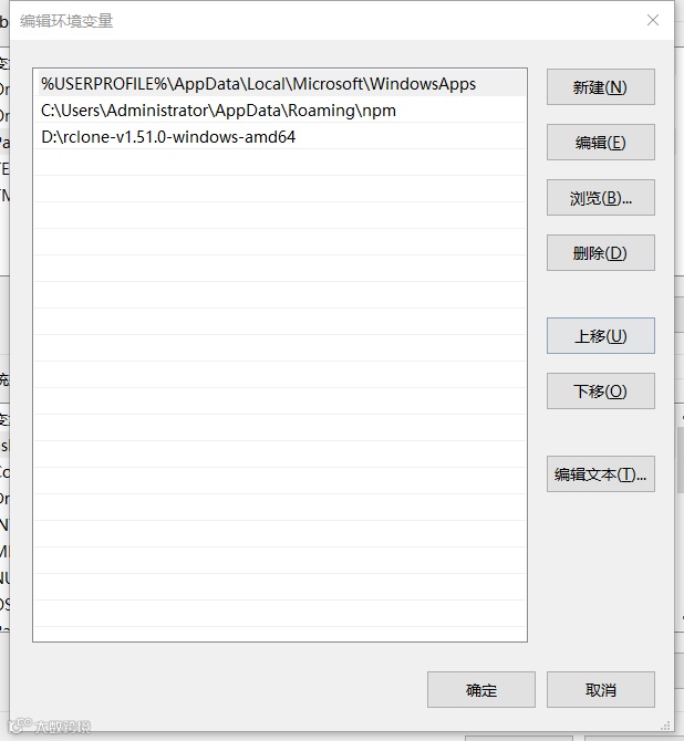 双击Path,把刚才解压到的文件路径新加到Path,比如我的D:\rclone-v1.51.0-windows-amd64: