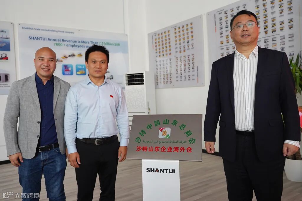 山东省贸促会贸促中心主任周亮同志和山推中东贸易有限公司董事长常洋先生为“沙特山东企业海外仓”揭牌,并与海外仓项目合作单位易通天下CEO安成文先生合影留念