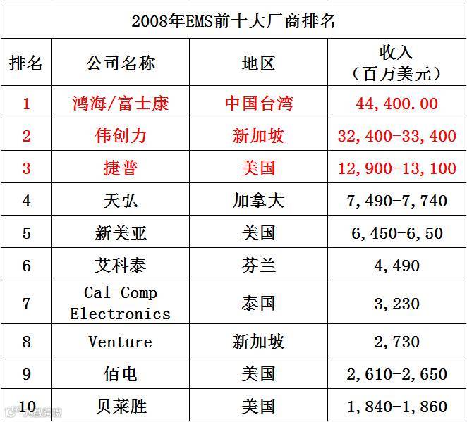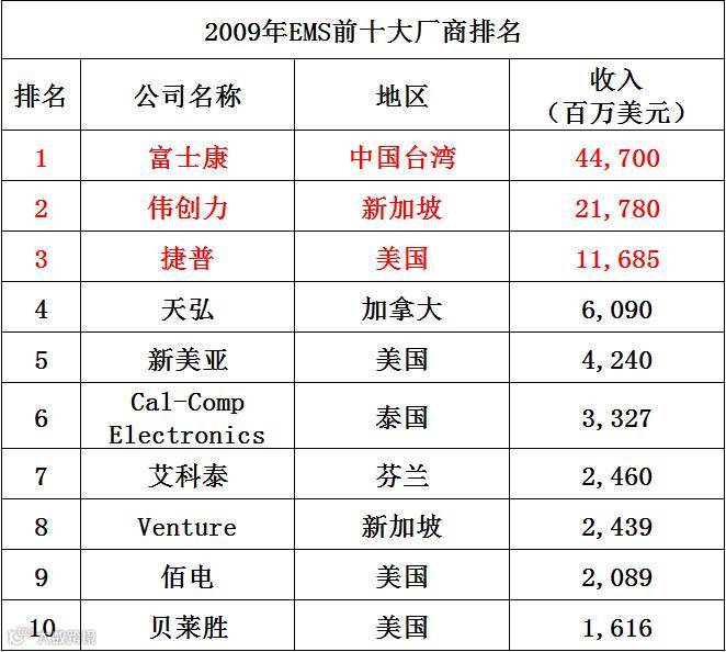 2009年EMS厂商前十名要求营收在15.9亿美元以上,比2008年的20.6亿美元要低。前三强依然延续2008年的排位,依次是富士康、伟创力、捷普。