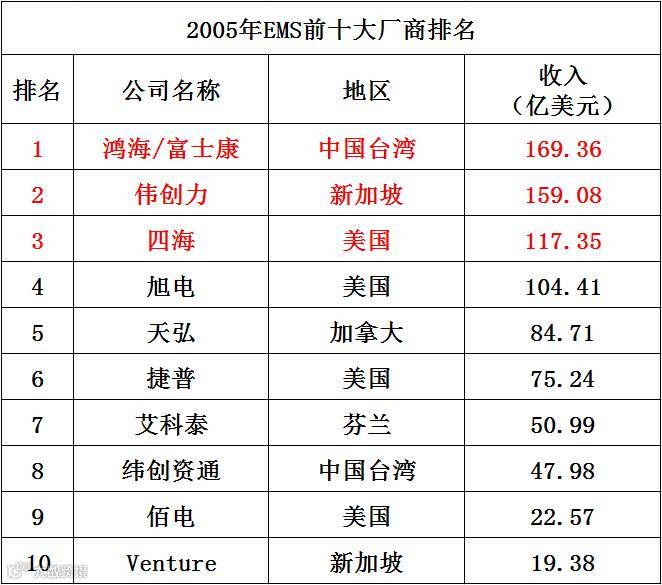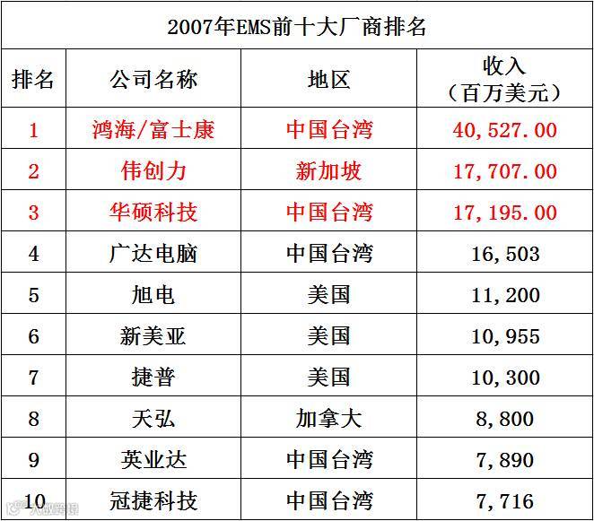 2007年,全球EMS似乎已是台湾的天下,前十榜单中有五席被台湾占据。当然,美国依然是EMS代工厂最强大的竞争对手。