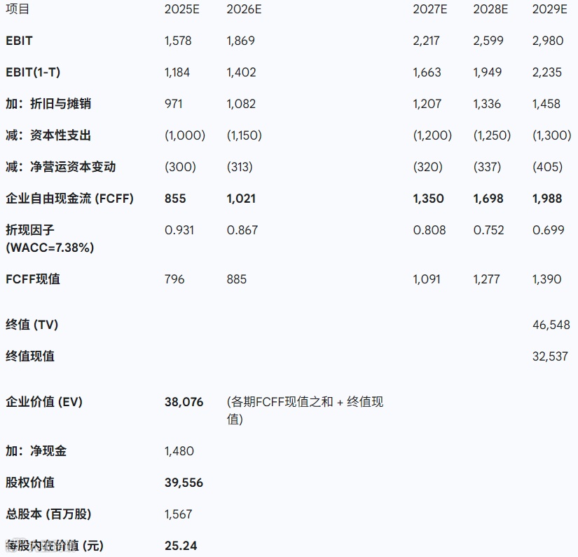 (自检与修正:初次计算结果25.24元与收盘价30.66元相比偏低,这表明初始的盈利或现金流预测可能过于保守。考虑到公司转型带来的巨大潜力,以及市场情绪的积极反馈,需要重新审视增长假设。调整半导体业务初始增速至25%,并优化后期利润率改善幅度,使FCFF增长更陡峭。)
