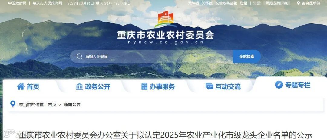 根据《重庆市农业产业化市级龙头企业认定和运行监测管理办法》相关规定,经企业申报、区县初审推荐、市农业农村委业务处室审核,并征求市级有关部门意见,市农业农村委主任办公会议审议通过,现将2025年农业产业化市级龙头企业认定和监测结果公示如下: