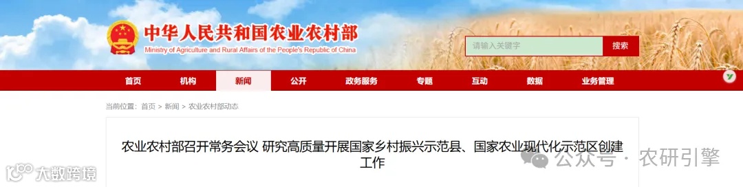 10月10日,农业农村部部长韩俊主持召开部常务会议,审议并原则通过《国家乡村振兴示范县创建工作方案(送审稿)》《国家农业现代化示范区创建工作方案(送审稿)》。