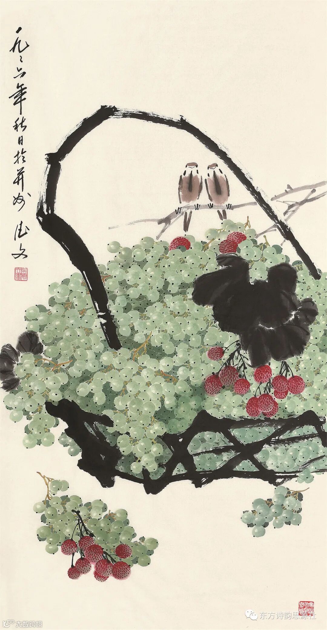 碧水池中翻白鲤,葡萄架下闪流莺。
