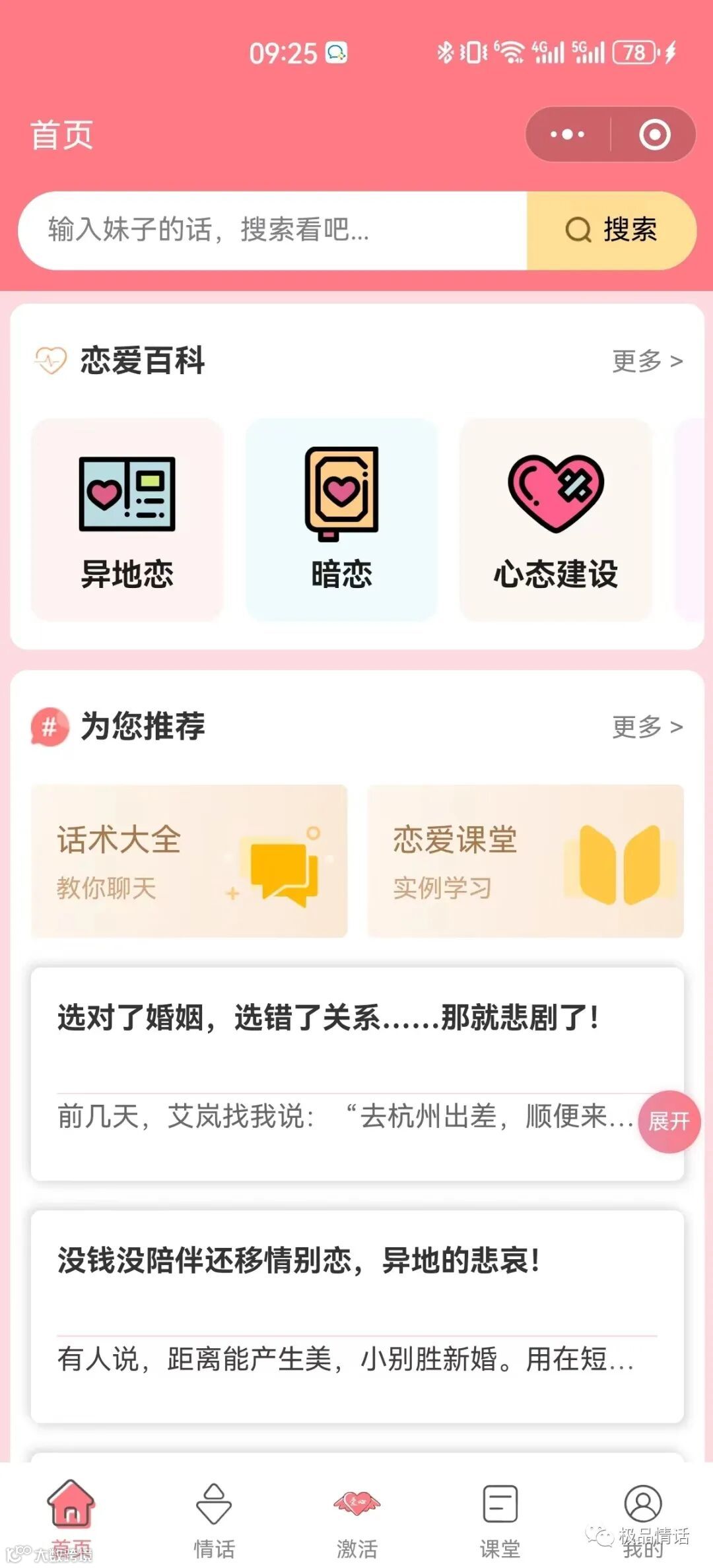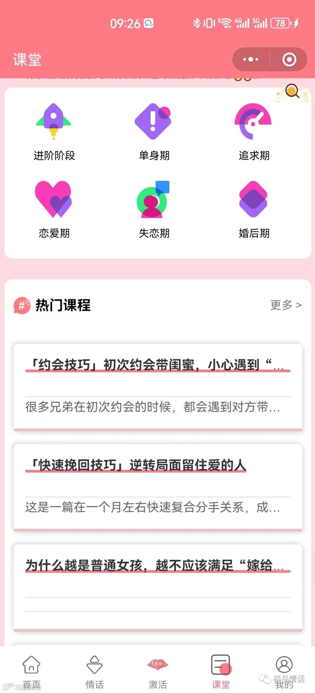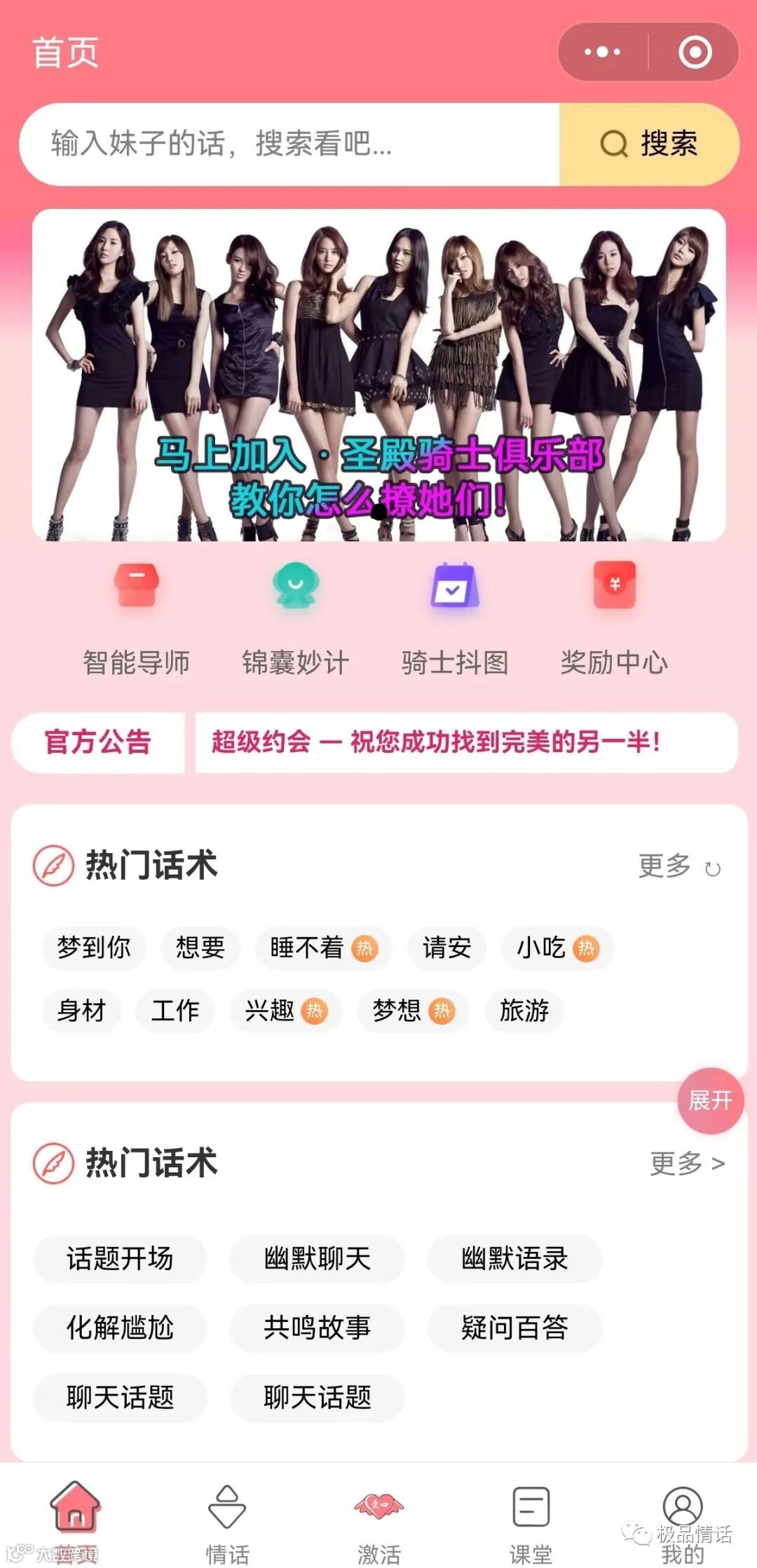 超100万的学员在【极品情话】小程序里学会了追女生技巧、搞定男生的套路,并成功脱单,各类真实脱单案例教程可以提升你的约会恋爱成功率,让你成为一个有魅力的男人有实力的女人,让您快速拥有完美的另一半。