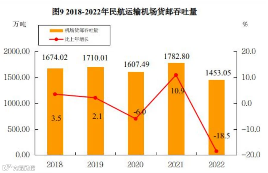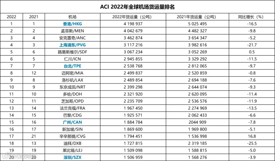 数据来源:国际机场协会(Airports Council International,ACI)在排名前10中,中国机场占据3个席位。其中,香港机场连续两年排名全球第1,货运量419.89万公吨,由于新冠疫情限制航班数量等原因同比下降16.5%;上海浦东机场排名下降一位至第4,受到新冠疫情及供应链等影响,货运量311.72万公吨,在前10的机场中降幅最大,降幅超过20%;台北机场连续3年排名第7。此外,广州白云机场上升1名,跻身前15;深圳宝安机场排名第20。