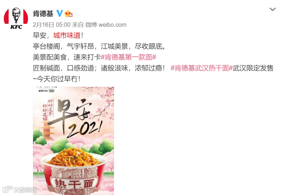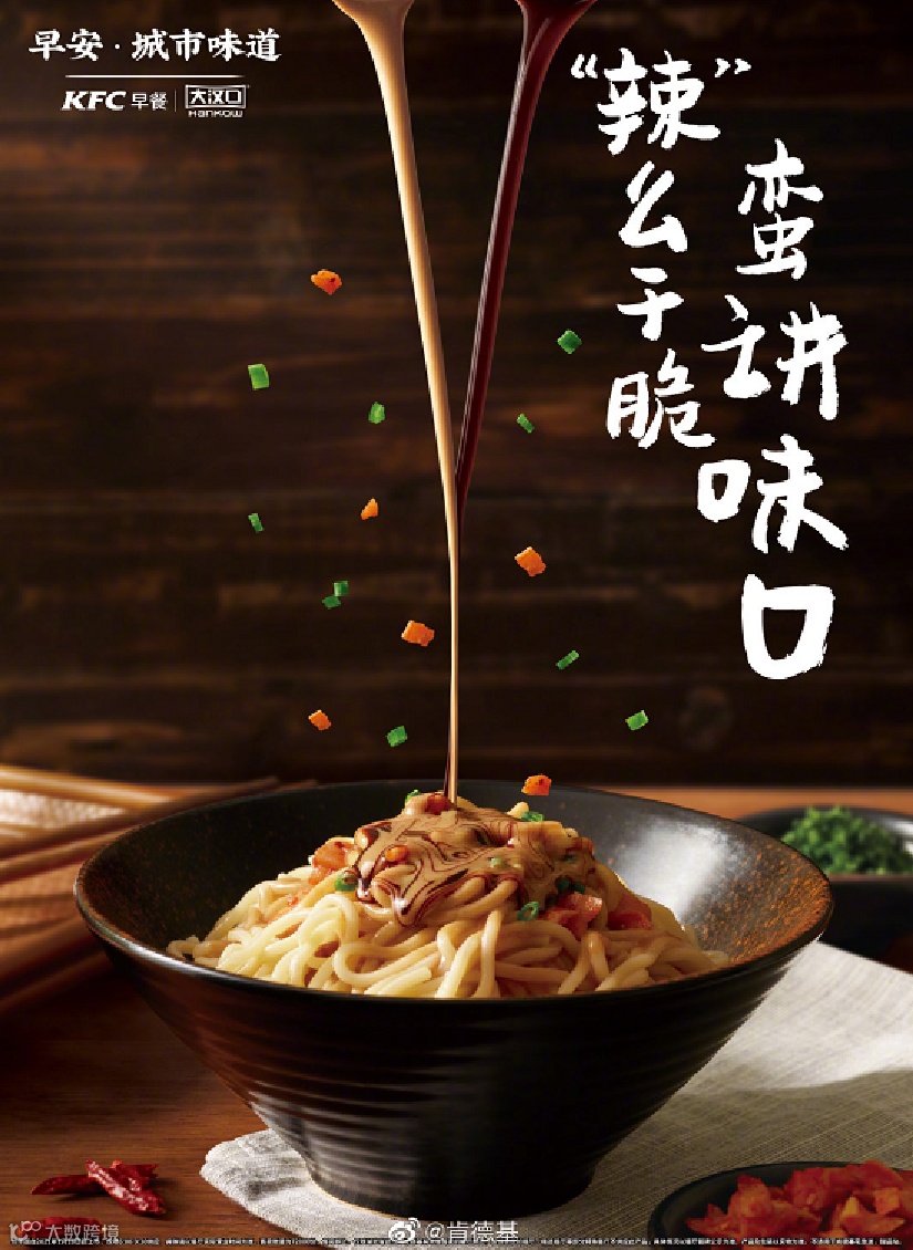 肯德基将油条、豆浆、稀饭、热干面等中式早餐纳入菜单,旨在迎合中国消费者的饮食习惯。此前推出的“武汉热干面”上线后引发当地消费者打卡热潮,带动线上话题传播与线下消费转化,凸显产品创新对品牌营销的推动作用[k]。