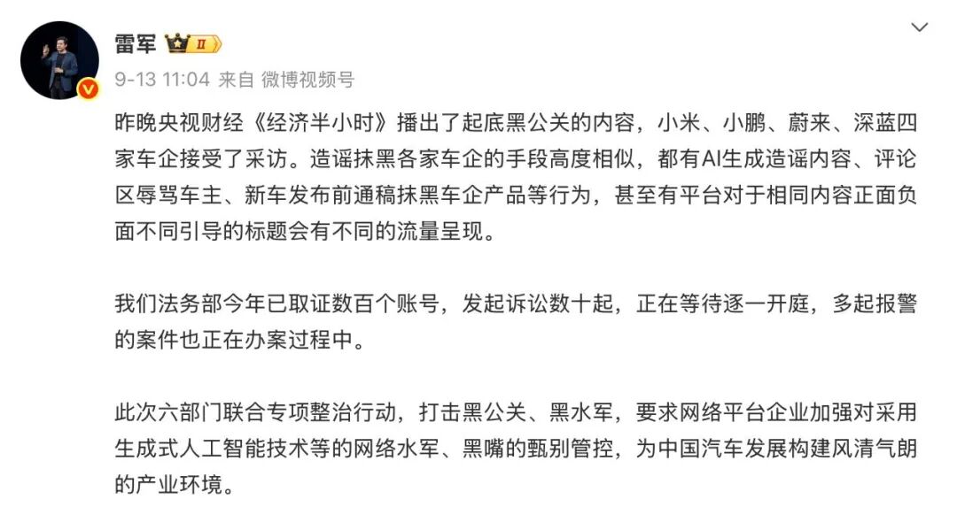 其次是雷军。10月16日在世界智能网联汽车大会上,雷军呼吁“全行业把资源集中到科技创新上,共同抵制网络水军、黑公关等网络乱象”。