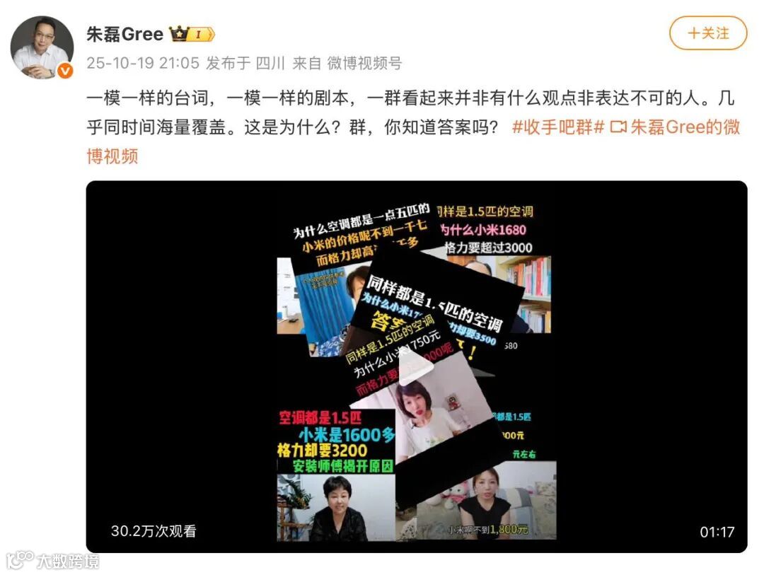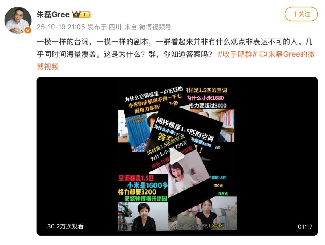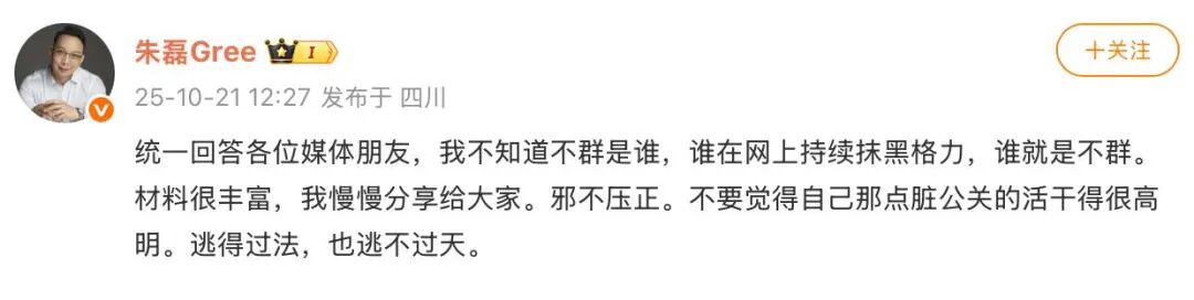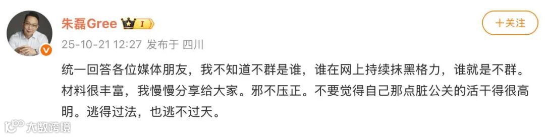 首先是格力电器市场总监朱磊。在格力刚刚打赢MCN造谣官司后,市场总监朱磊又在微博高调出击,怒斥有组织水军抹黑格力空调,还用“不群”“群”暗戳戳影射竞对老板。