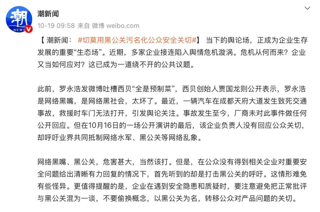 其次,企业信任基础正在被摊薄。过去企业与公众之间有较多的信任缓冲,但近年来这种缓冲带正在被压平。公众对企业回应的怀疑增多,尤其在涉及安全、质量或公共利益的问题上,单纯的否认或外推“黑公关”标签,会被视为回避而非负责。