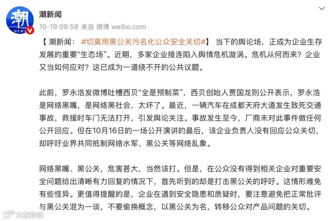 目前企业家IP很热,不少企业领导人被推到台前。领导人的简短表态,比如“抵制黑公关”,在没有前置解释或回应时,容易被不同群体以不同方式解读。