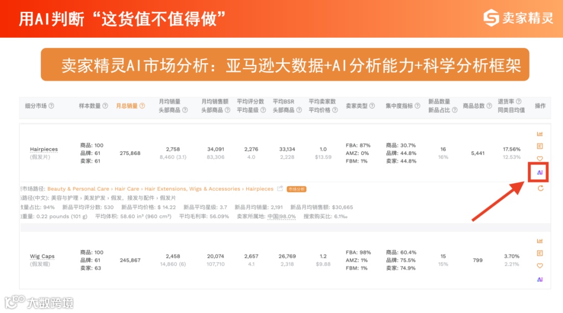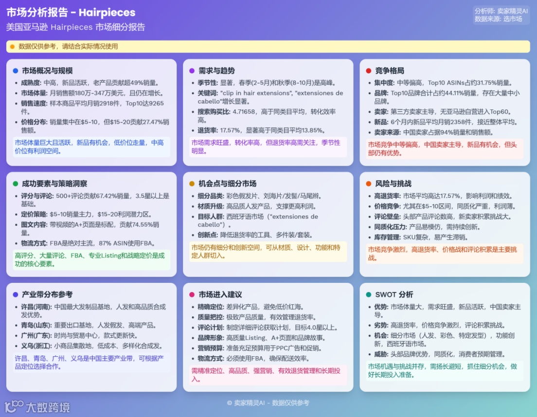 找到细分市场后,再用卖家精灵的AI市场分析功能,系统1分钟生成市场报告,自动展示规模、趋势、竞争格局、细分机会等9大维度数据信息。比如说,下面报告显示假发片这个市场的市场体量大,价格两极分化,季节性还很强,市场还有细分和功能创新空间,可以从真人发、时尚色、特定场景和配件切入等。几分钟,就能判断它是不是你能做的市场。