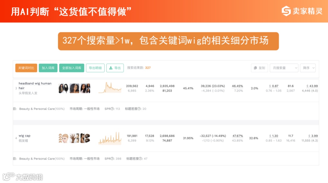 随即,卖家精灵Wendy提到很多卖家&工厂朋友的困惑:“怎么判断某个产业带的货,在海外市场到底值不值得做?” “哪些产品机会更大,风险又在哪?该怎么切入市场?”现在,AI+大数据能完美地解决这个问题。以“假发”类目为例,通过卖家精灵关键词选品搜索,会发现搜索量超过1万的相关市场就有300多个,从“假发帽”“假发片”到“半真半假假发”,每一个关键词背后,都是一个细分市场。