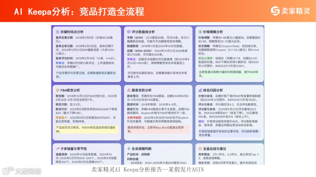 卖家在确定市场后,通过卖家精灵AI Keepa分析,能分析竞品的价格、销量、排名趋势,并快速识别出进入“爆发前期”的高潜力产品。让选品决策不再依赖感觉,而是基于数据。
