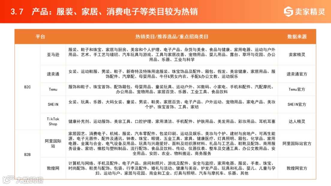 每个平台定位不同,你的产品放到哪些平台上比较容易出效果?报告里列了每个平台的热销类目,帮卖家精准匹配平台属性,一下找明方向。比如toc市场中,亚马逊的品类最全、而在TikTok上(达人精灵数据源),保健品、服饰、美容工具等更为热销。