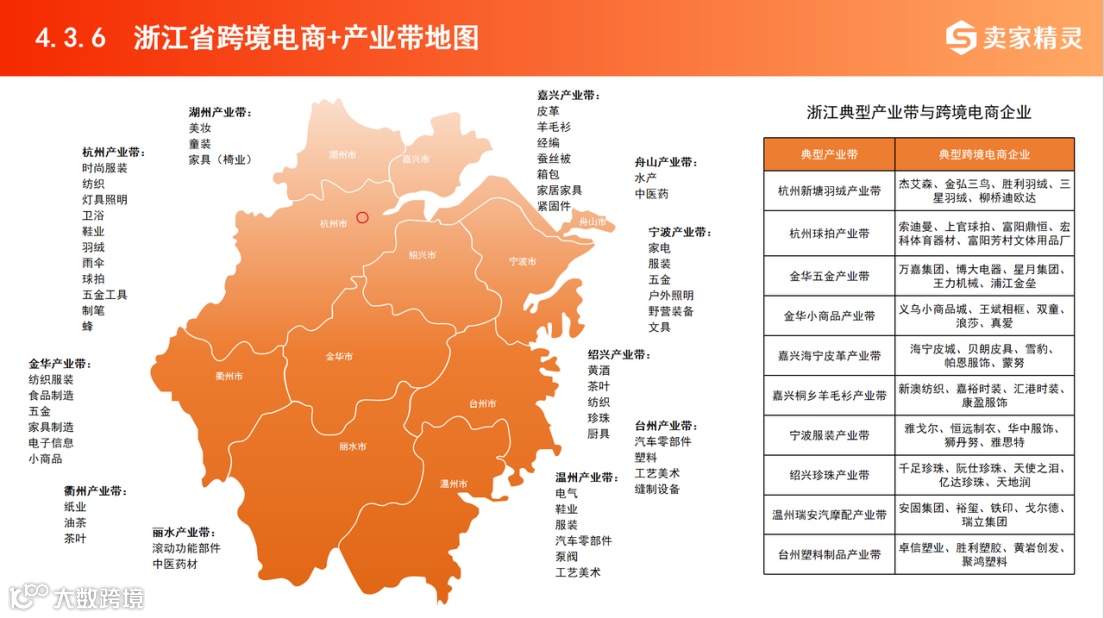 就浙江省来说,就有多条产业带。比如——在杭州、湖州、嘉兴等多个城市都有多条产业带,比较典型的产业带有杭州新塘羽绒产业、杭州球拍产业带等。其中新塘羽绒产业带中做得好的跨境电商企业有杰艾森、金弘三鸟等。