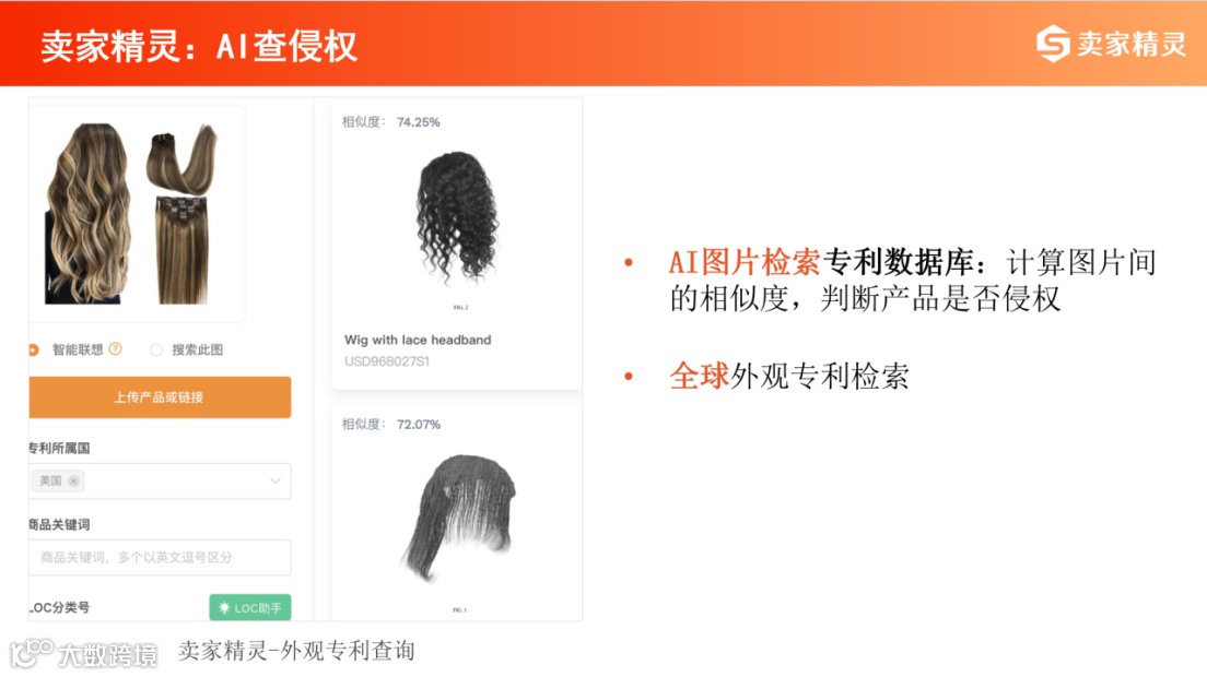 接着,卖家精灵Wendy提到跨境卖家比较头疼的事——产品外观专利。针对这块,卖家精灵外观专利查询,通过AI能帮助大家快速智能识别潜在风险,降低出海隐患等。