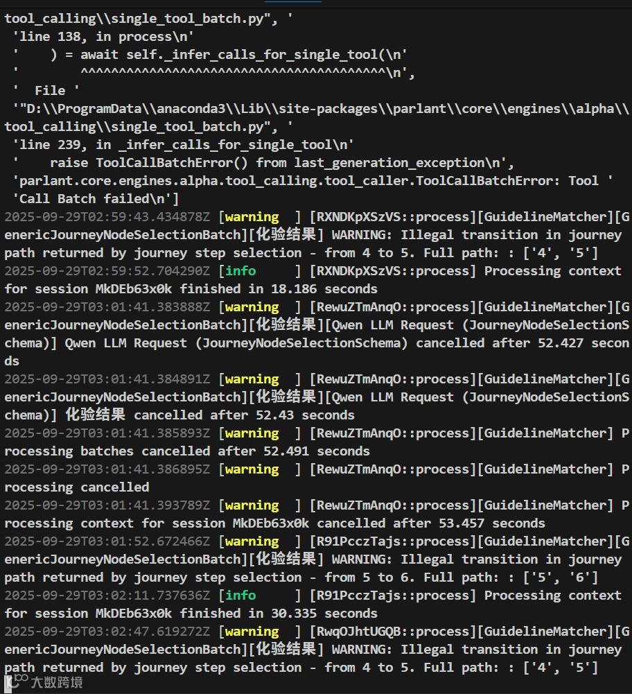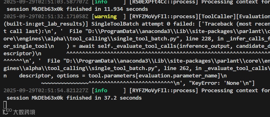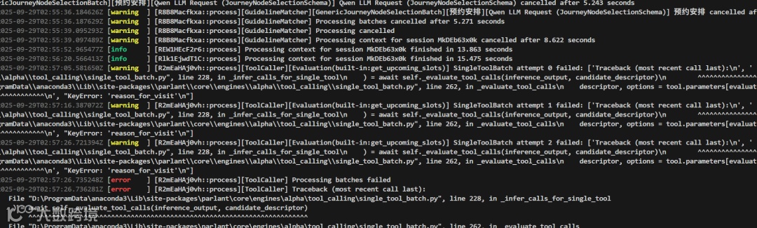 2025-09-29T02:57:26.747269Z [error ] [R2mEaHAj0vh::process][ToolCaller] Processing context for session MkDEb63x0k failed2025-09-29T02:57:26.749230Z [error ] [R2mEaHAj0vh::process][ToolCaller] Traceback (most recent call last):File "D:\ProgramData\anaconda3\Lib\site-packages\parlant\core\engines\alpha\tool_calling\single_tool_batch.py", line 228, in _infer_calls_for_single_tool) = await self._evaluate_tool_calls(inference_output, candidate_descriptor)^^^^^^^^^^^^^^^^^^^^^^^^^^^^^^^^^^^^^^^^^^^^^^^^^^^^^^^^^^^^^^^^^^^^^^^File "D:\ProgramData\anaconda3\Lib\site-packages\parlant\core\engines\alpha\tool_calling\single_tool_batch.py", line 262, in _evaluate_tool_callsdescriptor, options = tool.parameters[evaluation.parameter_name]~~~~~~~~~~~~~~~^^^^^^^^^^^^^^^^^^^^^^^^^^^KeyError: 'reason_for_visit''"D:\\ProgramData\\anaconda3\\Lib\\site-packages\\parlant\\core\\engines\\alpha\\tool_event_generator.py", ''line 131, in generate_events\n'' inference_result = await self._tool_caller.infer_tool_calls(\n'' ^^^^^^^^^^^^^^^^^^^^^^^^^^^^^^^^^^^^^^^^^\n',' File ''"D:\\ProgramData\\anaconda3\\Lib\\site-packages\\parlant\\core\\engines\\alpha\\tool_calling\\tool_caller.py", ''line 182, in infer_tool_calls\n'' return await self._do_infer_tool_calls(context)\n'' ^^^^^^^^^^^^^^^^^^^^^^^^^^^^^^^^^^^^^^^^\n',' File ''"D:\\ProgramData\\anaconda3\\Lib\\site-packages\\parlant\\core\\engines\\alpha\\tool_calling\\tool_caller.py", ''line 220, in _do_infer_tool_calls\n'' batch_results = await async_utils.safe_gather(*batch_tasks)\n'' ^^^^^^^^^^^^^^^^^^^^^^^^^^^^^^^^^^^^^^^^^^^\n',' File ''"D:\\ProgramData\\anaconda3\\Lib\\site-packages\\parlant\\core\\async_utils.py", ''line 148, in safe_gather\n'' return await asyncio.gather(\n'' ^^^^^^^^^^^^^^^^^^^^^\n',' File ''"D:\\ProgramData\\anaconda3\\Lib\\site-packages\\parlant\\core\\engines\\alpha\\tool_calling\\single_tool_batch.py", ''line 138, in process\n'' ) = await self._infer_calls_for_single_tool(\n'' ^^^^^^^^^^^^^^^^^^^^^^^^^^^^^^^^^^^^^^^^\n',' File ''"D:\\ProgramData\\anaconda3\\Lib\\site-packages\\parlant\\core\\engines\\alpha\\tool_calling\\single_tool_batch.py", ''line 239, in _infer_calls_for_single_tool\n'' raise ToolCallBatchError() from last_generation_exception\n','parlant.core.engines.alpha.tool_calling.tool_caller.ToolCallBatchError: Tool ''Call Batch failed\n']
