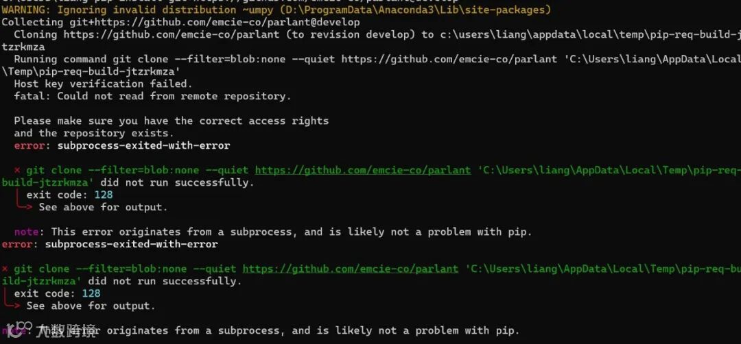 WARNING: Ignoring invalid distribution ~umpy (D:\ProgramData\Anaconda3\Lib\site-packages)Collecting git+https://github.com/emcie-co/parlant@developCloning https://github.com/emcie-co/parlant (to revision develop) to c:\users\liang\appdata\local\temp\pip-req-build-jtzrkmzaRunning command git clone --filter=blob:none --quiet https://github.com/emcie-co/parlant 'C:\Users\liang\AppData\Local\Temp\pip-req-build-jtzrkmza'Host key verification failed.fatal: Could not read from remote repository.Please make sure you have the correct access rightsand the repository exists.error: subprocess-exited-with-error× git clone --filter=blob:none --quiet https://github.com/emcie-co/parlant 'C:\Users\liang\AppData\Local\Temp\pip-req-build-jtzrkmza' did not run successfully.│ exit code: 128╰─> See above for output.note: This error originates from a subprocess, and is likely not a problem with pip.error: subprocess-exited-with-error× git clone --filter=blob:none --quiet https://github.com/emcie-co/parlant 'C:\Users\liang\AppData\Local\Temp\pip-req-build-jtzrkmza' did not run successfully.│ exit code: 128╰─> See above for output.note: This error originates from a subprocess, and is likely not a problem with pip.