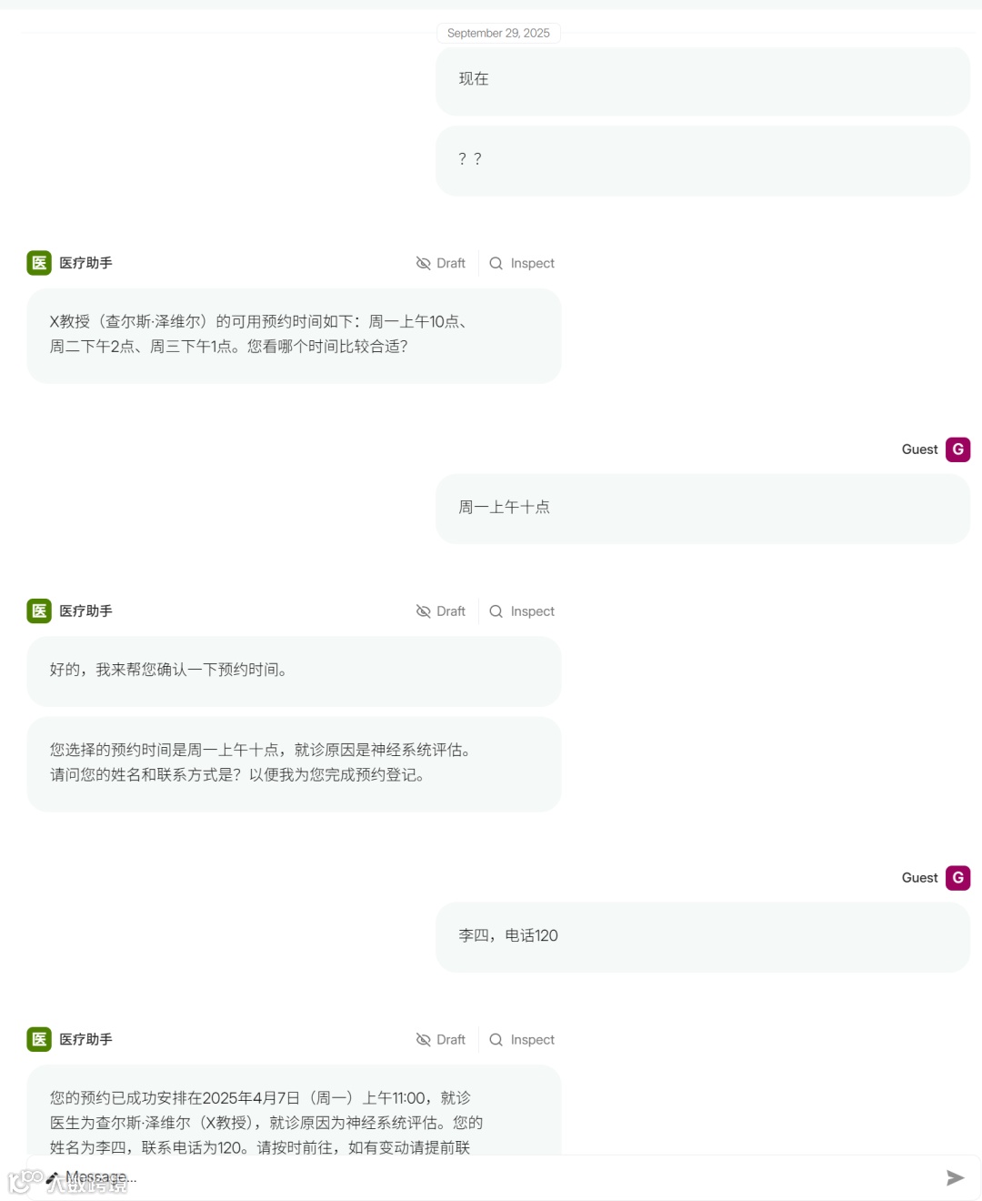 # healthcare.pyimport parlant.sdk as pimport asyncioimport osfrom datetime import datetimeasync def get_insurance_providers(context: p.ToolContext) -> p.ToolResult:return p.ToolResult(["大型保险公司", "顶点保险公司"])async def get_upcoming_slots(context: p.ToolContext) -> p.ToolResult:# 模拟从数据库或API获取可用时间段return p.ToolResult(data=["周一上午10点", "周二下午2点", "周三下午1点"])async def get_later_slots(context: p.ToolContext) -> p.ToolResult:# 模拟获取后续可用时间段return p.ToolResult(data=["11月3日上午11:30", "11月12日下午3点"])async def schedule_appointment(context: p.ToolContext, datetime: datetime) -> p.ToolResult:# 模拟预约安排return p.ToolResult(data=f"预约已安排在 {datetime}")async def get_lab_results(context: p.ToolContext) -> p.ToolResult:# 模拟从数据库或API获取化验结果,# 使用上下文中的客户ID。lab_results = {"report": "所有检测结果都在正常范围内","prognosis": "患者健康状况良好!",}return p.ToolResult(data={"report": lab_results["report"],"prognosis": lab_results["prognosis"],})async def add_domain_glossary(agent: p.Agent) -> None:await agent.create_term(name="办公室电话号码",description="我们办公室的电话号码,+1-234-567-8900",)await agent.create_term(name="办公时间",description="办公时间为周一至周五,上午9点到下午5点",)await agent.create_term(name="查尔斯·泽维尔",synonyms=["X教授"],description="专门从事神经科工作的医生,周一和周二坐诊。",)# 如需要,在此处添加其他特定术语和定义...# <<添加此函数>>async def create_scheduling_journey(server: p.Server, agent: p.Agent) -> p.Journey:# 创建旅程journey = await agent.create_journey(title="预约安排",description="帮助患者找到适合的预约时间。",conditions=["患者想要预约"],)# 首先,确定预约原因t0 = await journey.initial_state.transition_to(chat_state="确定就诊原因")# 将即将到来的预约时间段加载到上下文中t1 = await t0.target.transition_to(tool_state=get_upcoming_slots)# 询问哪个时间段适合他们# 我们将根据患者的回复从此处有条件地转换t2 = await t1.target.transition_to(chat_state="列出可用时间并询问哪个时间段适合他们")# 我们从患者选择时间的愉快路径开始t3 = await t2.target.transition_to(chat_state="在安排前与患者确认详细信息",condition="患者选择了时间",)t4 = await t3.target.transition_to(tool_state=schedule_appointment,condition="患者确认了详细信息",)t5 = await t4.target.transition_to(chat_state="确认预约已安排")await t5.target.transition_to(state=p.END_JOURNEY)# 否则,如果他们说这些时间都不行,询问后续时间段t6 = await t2.target.transition_to(tool_state=get_later_slots,condition="这些时间对患者都不合适",)t7 = await t6.target.transition_to(chat_state="列出后续时间并询问是否有合适的时间")# 如果他们选择时间,转换回我们的愉快路径await t7.target.transition_to(state=t3.target, condition="患者选择了时间")# 否则,请他们致电办公室t8 = await t7.target.transition_to(chat_state="请患者致电办公室预约",condition="这些时间对患者也都不合适",)await t8.target.transition_to(state=p.END_JOURNEY)# 使用指导原则有意识地处理边缘情况await journey.create_guideline(condition="患者说他们的就诊很紧急",action="告诉他们立即致电办公室",)return journeyasync def create_lab_results_journey(server: p.Server, agent: p.Agent) -> p.Journey:# 创建旅程journey = await agent.create_journey(title="化验结果",description="获取患者的化验结果并进行解释。",conditions=["患者想要查看他们的化验结果"],)t0 = await journey.initial_state.transition_to(tool_state=get_lab_results)await t0.target.transition_to(chat_state="告诉患者结果尚未可用,请稍后再试",condition="找不到化验结果",)await t0.target.transition_to(chat_state="向患者解释化验结果 - 结果正常",condition="化验结果良好 - 即无需担心",)await t0.target.transition_to(chat_state="呈现结果并请他们致电办公室 ""对结果进行澄清,因为你不是医生",condition="化验结果不好 - 即患者健康有问题",)# 使用指导原则处理边缘情况...await agent.create_guideline(condition="患者催促你提供更多关于化验结果的结论",action="明确告诉他们你无法帮助,他们应该致电办公室",)return journeyasync def main() -> None:# 设置千问服务配置os.environ['BASE_URL'] = 'http://您的IP:端口/v1' # 私有化部署的千问模型地址os.environ['EMBEDDING_BASE_URL'] = 'http://您的IP:端口/v1' # 私有化部署的embedding模型地址os.environ['DASHSCOPE_API_KEY'] = 'not-needed' # 私有化部署不需要 API keyos.environ['QWEN_MODEL'] = 'qwen3-30b-a3b-instruct' # 使用的模型名称async with p.Server(nlp_service=p.NLPServices.qwen) as server:agent = await server.create_agent(name="医疗助手",description="对患者富有同情心且能安抚情绪。",)await agent.create_canned_response("今天我能为您做什么?")await add_domain_glossary(agent)scheduling_journey = await create_scheduling_journey(server, agent)lab_results_journey = await create_lab_results_journey(server, agent)status_inquiry = await agent.create_observation("患者询问跟进就诊情况,但具体方式不明确",)# 使用此观察来区分两个旅程await status_inquiry.disambiguate([scheduling_journey, lab_results_journey])await agent.create_guideline(condition="患者询问保险问题",action="列出我们接受的保险提供商,并告诉他们致电办公室了解更多详情",tools=[get_insurance_providers],)await agent.create_guideline(condition="患者要求与人工代理通话",action="请他们致电办公室,提供电话号码",)await agent.create_guideline(condition="患者询问与我们医疗保健无关的事情",action="礼