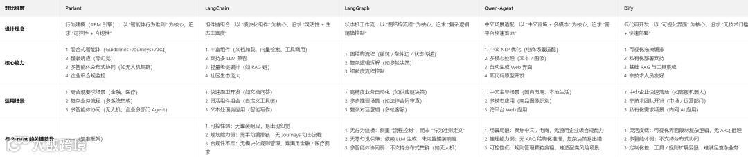 Parlant 与主流框架的差异,本质是设计理念(行为建模 vs 组件组合 / 流程控制 / 低代码) 和核心目标(企业级可控性 vs 灵活度 / 快速落地) 的不同