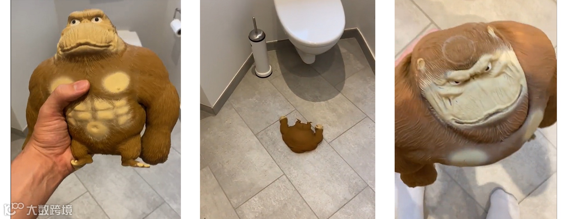 这条仅有短短七秒时长的视频拿下了 4 千五百万播放。视频极为简单。他在卫生间随手一抛,重拾起重重砸落在地面上的弹力猩猩。面对无故而来的摔打和暴击,这只可怜的猩猩似乎用一种轻蔑,不屑而又愤恨的表情来回应。