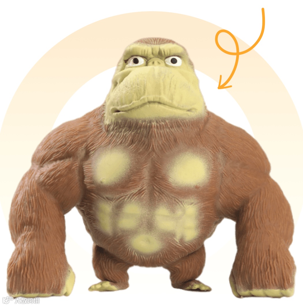 这只用内部用沙子和 TPR 橡胶填充,外形蠢萌憨厚的大猩猩,可以被各种敲打,拉伸和揉捏。