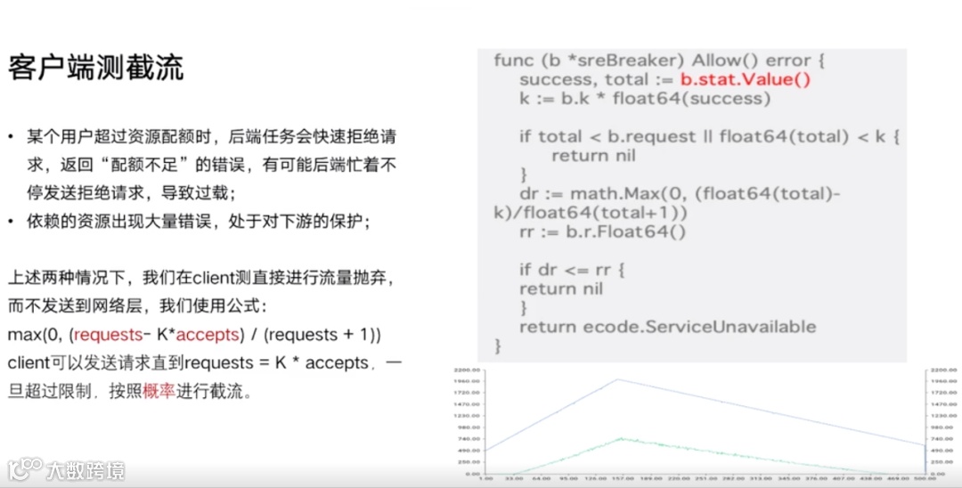 基于这么一个简单的公式,不需要依赖什么 ZooKeeper,什么协调器之类的,就可以得到一个概率丢弃一些请求。它尽可能的在服务不挂掉的情况下,放更多的流量进去,而不是像 Netflix 一样全部拒掉。