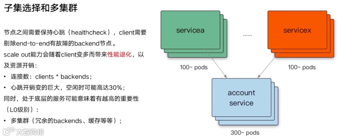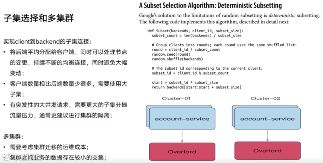 解决:以前是一个 client 跟所有的 backend 建立连接,做负载均衡。现在引入一个新的算法,子集选择算法,一个 client 跟一小部分的 backend 建立连接。图片中示例的算法,是从《Site Reliability Engineering》这本书里看的。