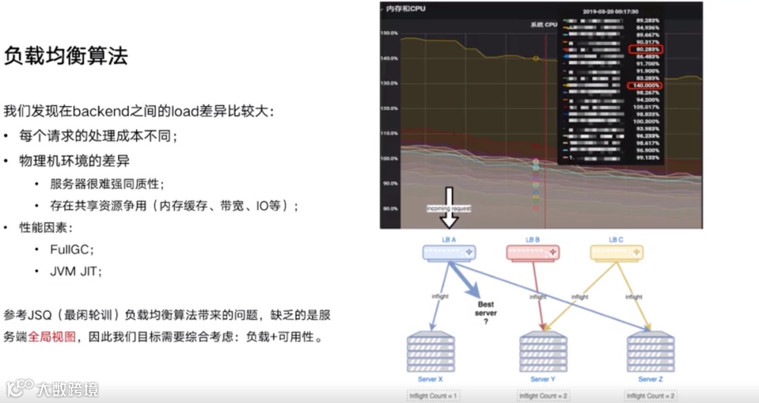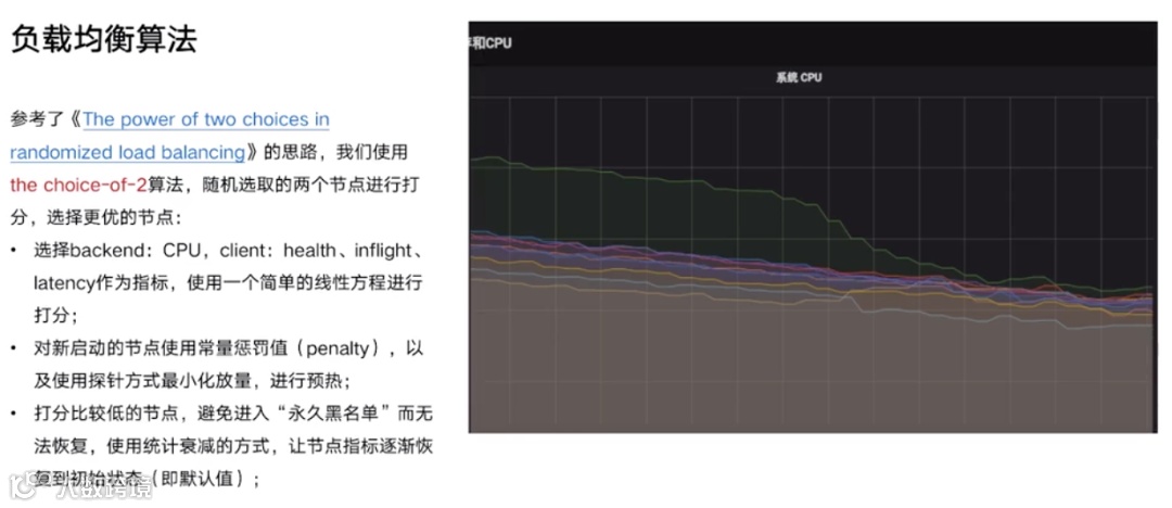 A: 服务端主要用 CPU,客户端用的是健康度,指连接的成功率,延迟也很重要,每个 Client 往不同的 Backend 发了多少个请求,四个指标归一,写一个线性方程,进行打分。