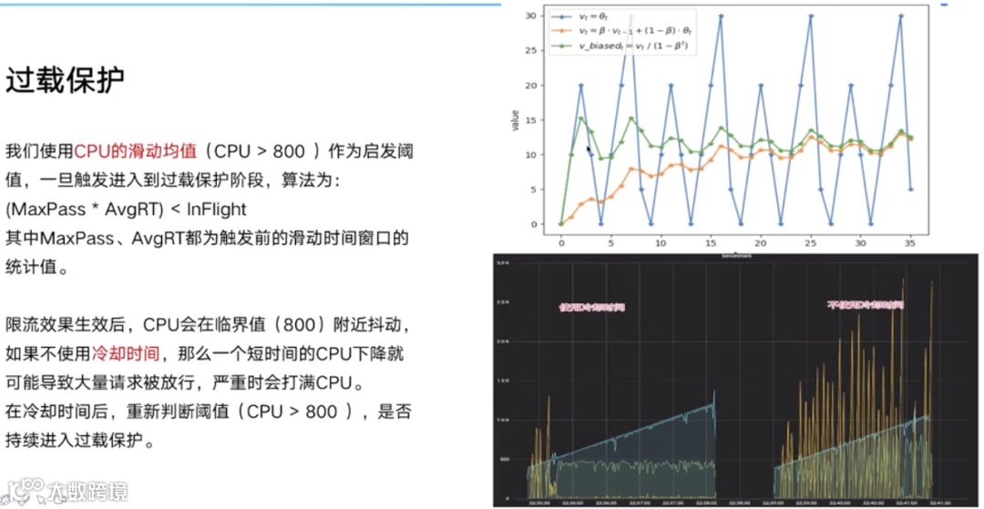 那么吞吐如何计算?利特尔法则。当前的 QPS * 延迟 = 吞吐,可以用过去的一个窗口作为指标。一旦丢弃流量,CPU 立马下来,算法抖动非常厉害。图二右侧黄色线表示抖动非常高,绿色线表示放行的流量也是抖动非常高,所以又加了冷却时间,比如持续几秒钟,再重新判断。