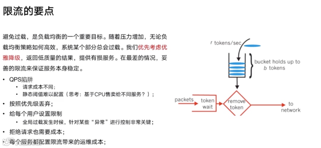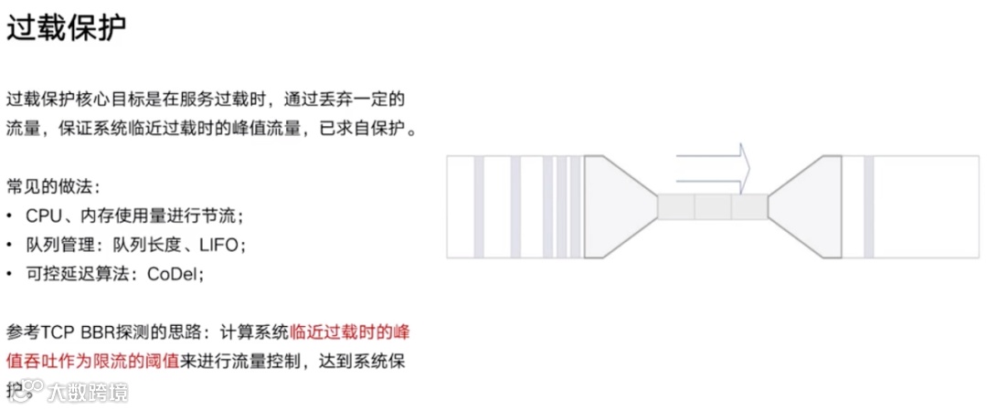 B 站参考了阿里的 Sentinel 框架、Netflix 的一些文章等,最终采用的是类似于 TCP BBR 探测的思路和算法。简单说:当 CPU 达到 80% 的时候,这个时候我们认为流量过载,如果此时吞吐量比如 100,用它作为阈值,瞬时值的请求比如是 110,那就可以丢掉 10 个流量。这样就可以实现一个限流算法。