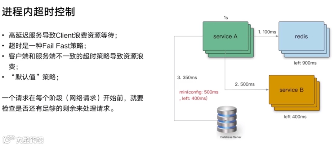 某个服务需要在 1 秒返回,内部可能需要访问 Redis,需要访问 RPC,需要访问数据库,时间加起来就超过 1 秒,那么访问完每一层,应该计算供下一层使用的超时时间还剩多少可用。在 go 语言里,可能会使用 Context,每一个网络请求开始的阶段,都要根据配置文件配置的超时时间,和当前剩余多少,取一个最小值,最终整个超时时间不会超过 1 秒。