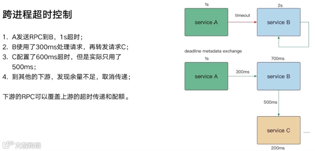 通过 RPC 的元数据传递,类似 HTTP 的 request header,带给其它服务。例如在图中,就是把 700ms 这个配额传递给 Service B。