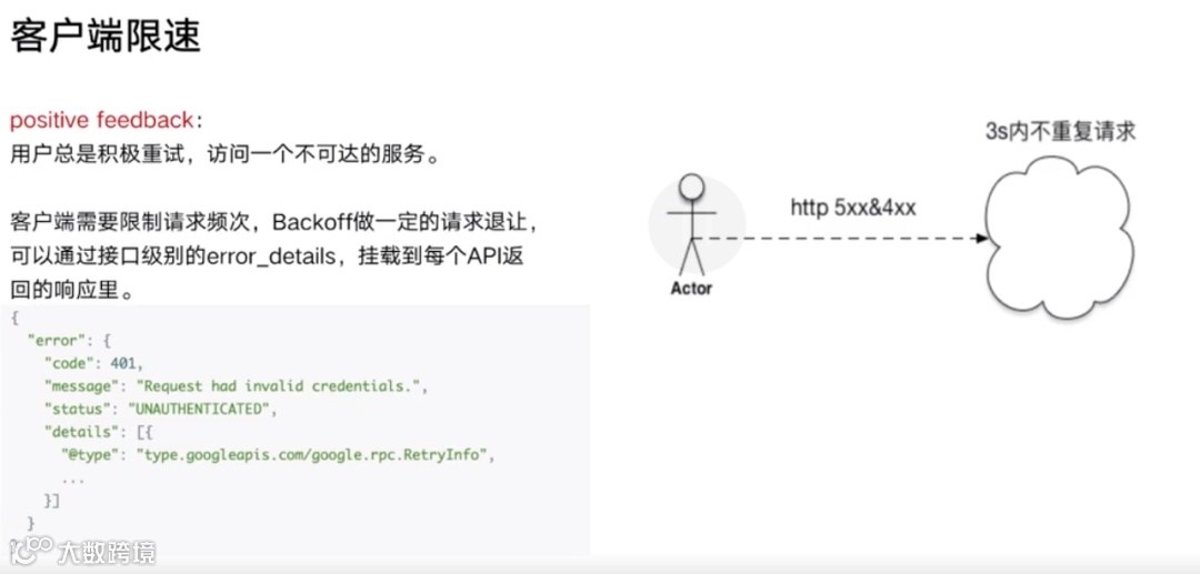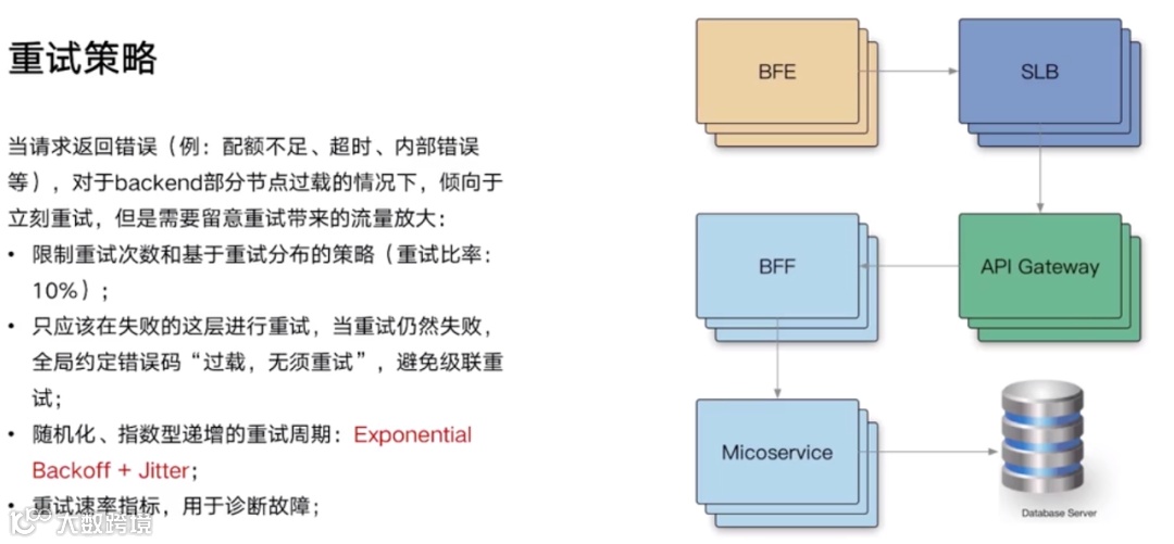这样最多产生 1.1 倍的放大,重试 3 次,极端情况下,会产生 3 倍放大。还有在重试的时候,尽量引入随机、指数递增的一个重试周期,大家不要都重试 1 秒钟,有可能会堆砌一个重试的波峰。