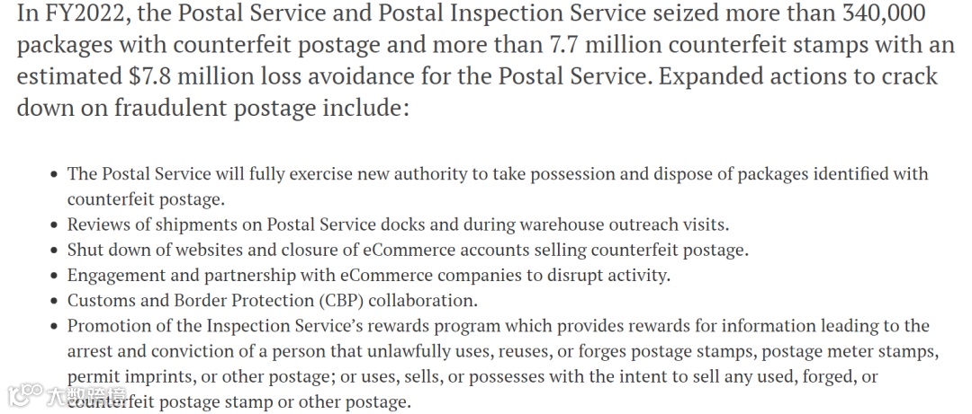 据悉,在2022 财年邮政管理局和邮政检查局共计查获超过34万个带有虚假面单的包裹和超过770 万张假邮票,避免了780万美元的损失。