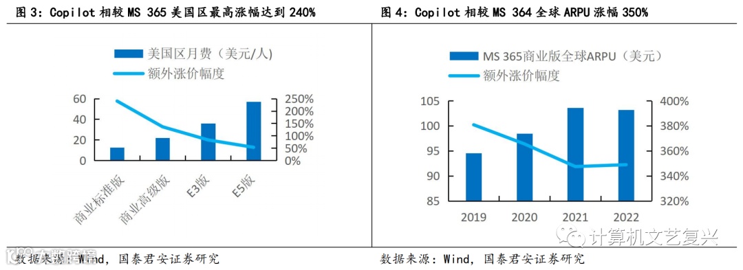 根据已经公布的定价规则,对于目前已经在付费使用Microsoft 365商业标准版、商业高级版、E3版及E5版的用户,可以按照每位用户每月30美元的价格附加订阅Copilot服务。目前美国区Microsoft 365四档会员的月费订阅价格分别为12.5/22/36/57美元,Copilot相当于涨价240%/136%/83%/53%;根据微软年报测算,2022年Microsoft 365商业版年营收达到370亿美元,平均年费会员数为3.61亿,ARPU为103美元,Copilot相当于涨价350%。如果未来企业客户对Copilot的接受度较高,Copilot对于微软办公软件业务长期成长空间的拉动效应将十分显著。