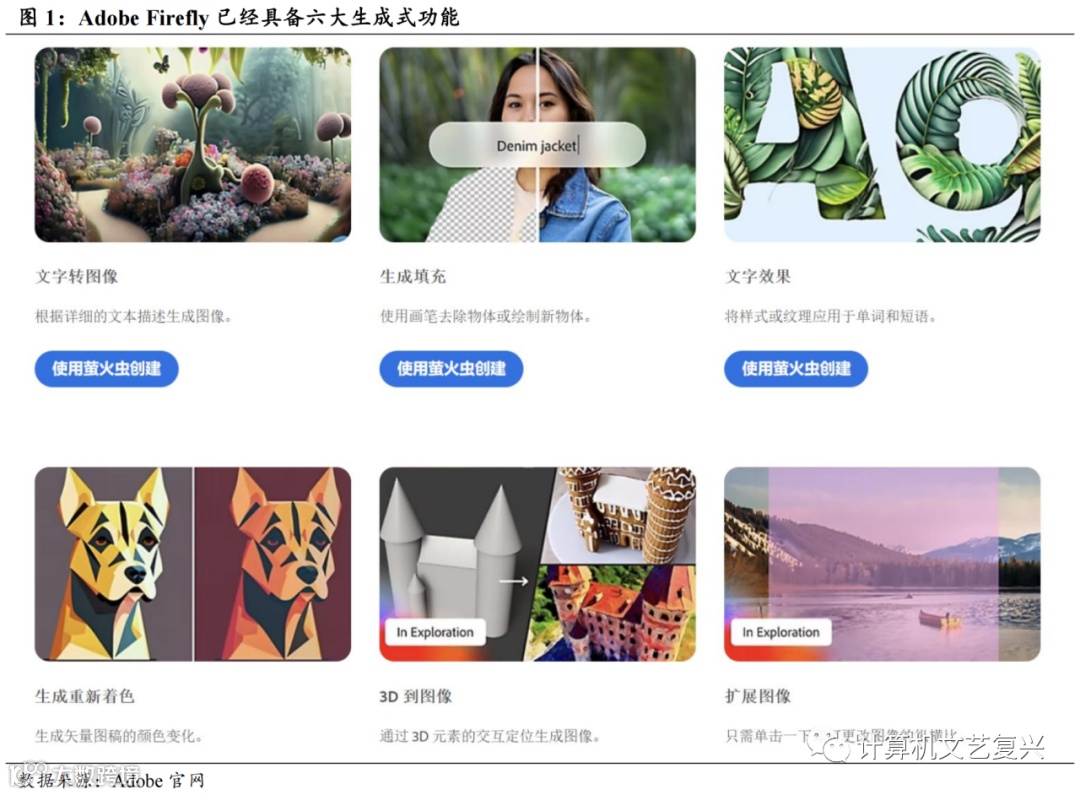 创意办公软件龙头Adobe厚积薄发,推出创意内容生成大模型Adobe FireFly。2022年7月智能文生图软件Midjourney公测,可利用AI技术根据用户文字指令自动生成图片,引起了消费者的追捧,掀起一阵AI作图的热潮。Adobe作为全球创意办公软件的龙头,自然不会错过自身所处核心赛道的AI变革机遇,在经过更充分的准备后,Adobe在2023年3月31日开始公测其创意内容生成大模型Adobe FireFly。目前Firefly已经上线了文字转图像、生成式填充、文字效果处理、矢量图稿重新着色四大核心功能,并即将上线3D模型转图像以及拓展图像内容的功能。