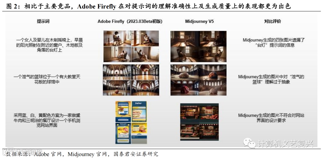 更丰富的AIGC功能和更优质的客户落地场景:在AIGC的功能性上,竞品主要集中在文本转图像的单一功能上,虽然目前FireFly的能力也还集中在对图像和矢量图稿的生成及处理上,但凭借其在音视频领域的深厚积累,在不久的将来,Firefly将上线视频、音频、动画、动图等领域的生成式功能,使其多模态能力不断强化;同时Adobe有大量的图像、音视频领域的专业设计师和企业级客户,AI功能会直接提升客户的生产力,从而客户会有较高的付费意愿,而竞品主要面向C端用户,用户容易在尝鲜心理结束后逐渐丧失付费意愿。